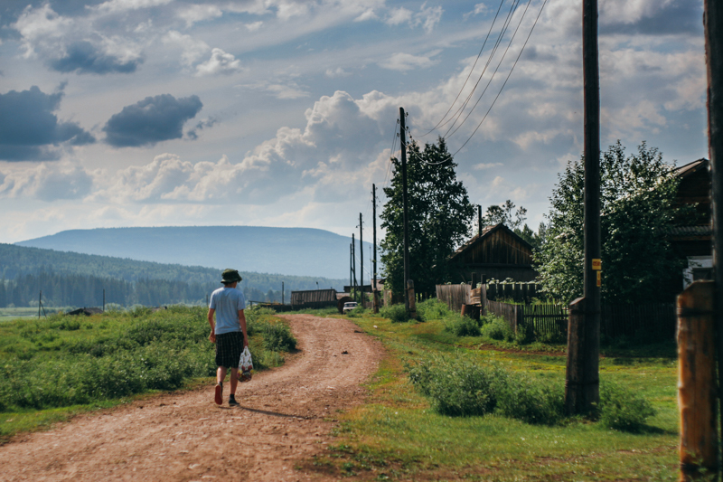Ojciec poszedł do wsi, a my się przebieramy i pakujemy najcenniejsze rzeczy do podręcznego plecaka. Wieś jest całkiem spora, są tu dwa sklepy (ros. Магазин). Kupujemy trochę cukru i słodyczy. Dowiadujemy się, że w kolejnej wiosce podobno mieszkali kiedyś Polacy. Klimat niesamowity - nie ma żadnych oznaczeń ani nic takiego, sklep to po prostu jeden z pokojów w zwyczajnym, drewnianym domu. W korytarzu stoją upakowane ciasno opakowania z cukrem i mąką, na ladzie leży liczydło, izba jest słabo oświetlona przez jedną, zwisającą z sufitu żarówkę. Zwiedzamy okolicę. Ktoś nas mija na motorze. Naszą uwagę przykuwają liście konopi. Zapewne i tutaj jest nielegalna, ale ponad pięć tysięcy kilometrów od Moskwy jest jedynie chwastem. Michał zrywa liść i bierze ze sobą, zastanawia się czy nie przemycić do Polski (pół żartem, pół serio). Kawałek dalej stoi cerkiew. Pusta i grożąca zawaleniem - została zamknięta około sto lat temu, zapewne przez komunistyczy rząd.