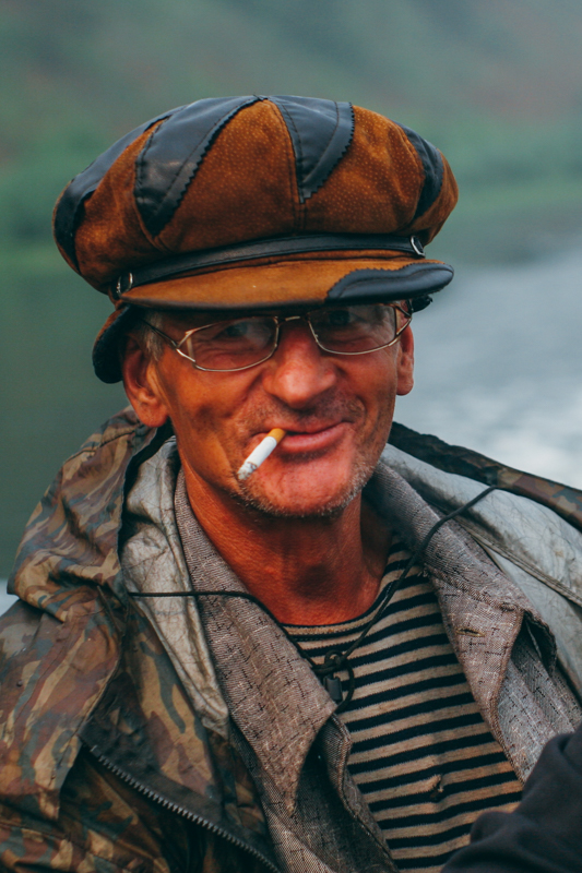 Ci z Was, którzy mieli okazję pić prawdziwe mleko, powinni wiedzieć o co chodzi, resztę zachęcam do nadrobienia tego doświadczenia. Nie mogę oderwać wzroku od Włodka, który je pomidora z cukrem - zdjęcie które mu zrobiłem należy do jednego z moich ulubionych portretów, jakie uchwyciłem w ciągu swojego życia. Wychodzimy na dwór, Marina daje Michałowi psinkę do zabawy, po okolicy szlaja się kot. Po chwili beztroskiej zabawy z zwierzakami postanawiamy, że pora ruszyć. Zbieramy od naszych gospodarzy garść informacji: kiedy możemy złapać stąd transport do Irkucka i kiedy kursuje pociąg z Ust-Uck. Staramy się dowiedzieć, czy uda nam się w okolicy znaleźć opuszczony Łagier (ale ten temat podrążymy jeszcze w innej wiosce). Pytamy też, czy dalej na północ prowadzi też jakaś droga - prowadzi, ale jest przejezdna tylko dla czołgów. Wsiadamy na tratwę wyładowani czterema (sic!) dodatkowymi siatkami jedzenia od naszych gospodarzy (wspominałem już, że ludzie ze wschodu bywają przesadnie gościnni?). Dostaliśmy również dwa wiosła od pontonu i długą belkę, która posłuży nam do sterowania naszą łajbą. I ruszyliśmy.