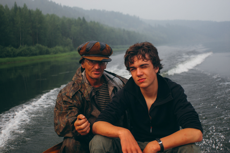 W ciągu kolejnej godziny rozpogadza się - wychodzi słońce, powoli robi się coraz cieplej. Jeszcze nie ma meszek - to chyba największa zaleta deszczu. Po tej godzinie zaczepia nas na rzece starszy mężczyzna w pomarańczowej motorówce. Włodzimierz, bo jak się okazuje, tak ma na imię, wozi towary do sklepów wzdłuż rzeki, aż z Żygałowa (w naszych głowach pojawia się myśl, że to cenny kontakt, być może okazja do załatwienia transportu). Z nim rozmawiamy stosunkowo długo bo ponad godzinę. Opowiada całkiem ciekawie. Tubylcy nie lubią rosyjskich turystów, którzy podróżują tu w “burżujski” sposób - przylatują swoimi helikopterami, i traktują ich z góry. Ale tacy jak my to co innego, można porozmawiać jak człowiek z człowiekiem. Tematy płynnie się zmieniają - podobno wbrew pozorom, dużo ludzi tu przyjeżdża - w Irkucku jest klub speleologiczny, bo w tych terenach są ogromne jaskinie. Najciekawsza jak dla mnie historia dotyczy Japończyków. Podobno Na Syberię przyjechali Japończycy, ponieważ potrzebowali cerkwii do jednego z swoich filmów. Przylecieli helikopterami i zwyczajnie przenieśli sobie cerkiew na oddalony o kilkaset kilometrów plan filmowy. Ciekawe ile ich to kosztowało. Po jakimś czasie Włodzimierz postanawia pokazać nam, jak łowi się ryby siecią, ale ostrzega, że to jest tutaj nielegalne i nerwowo się rozgląda co jakiś czas, czy nikt go nie złapie. Michał wsiada na jego łódź, holują nas kawałek i rozwieszają sieć między naszą tratwą a jego motorówką. Tata mi mówi, że jeszcze jeden papieros od naszego nowego przyjaciela i po prostu nie wytrzyma. Podobno są strasznie mocne. A tutaj papierosy to codzienność i każdy wprawiony podróżnik wie, że na wschodzie są, obok wódki, najlepszą walutą.